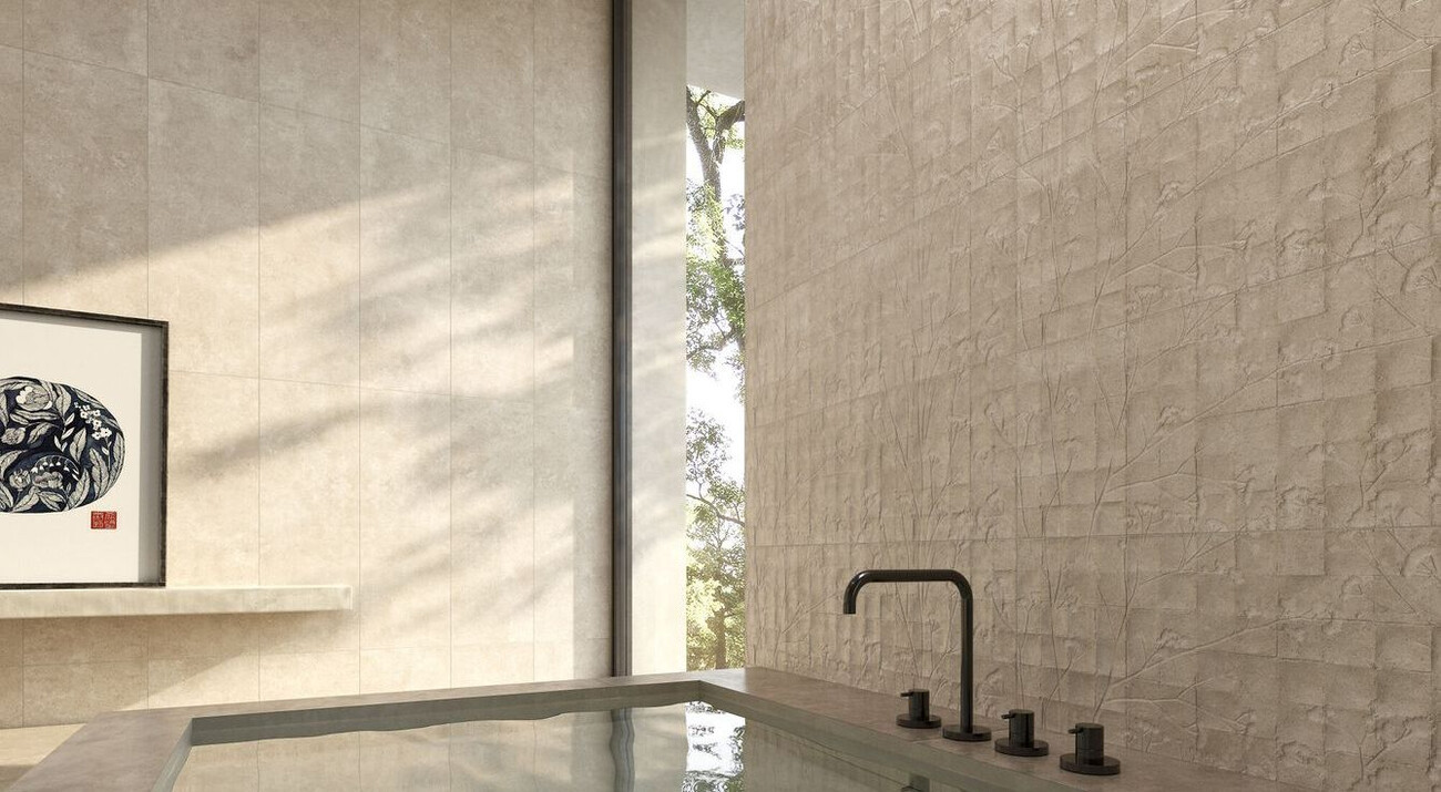 Плитка 100x33 Charme Sand Fleur R 40653 матовая бежевый бетон, цемент, с рисунком Peronda