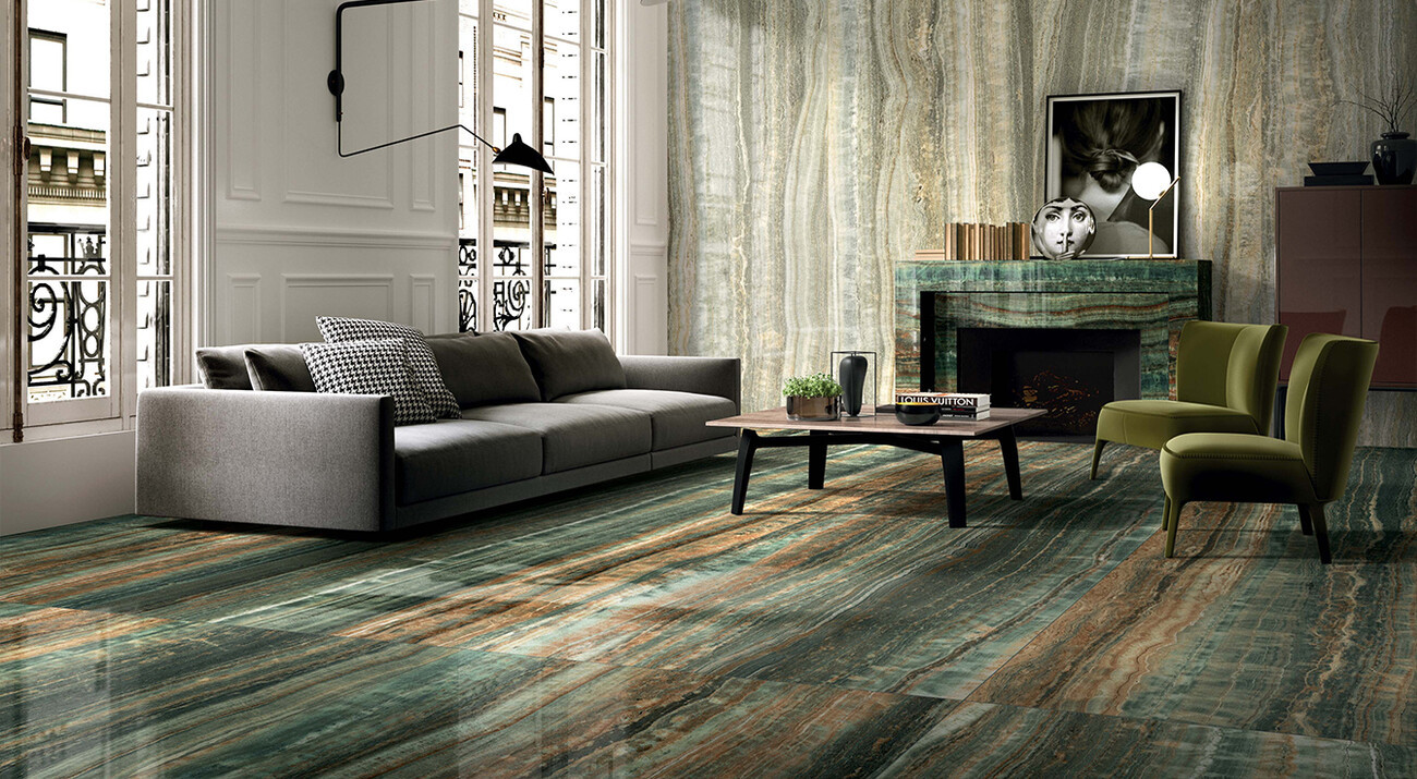 Плитка 180x80 9мм Eccentric Luxe Sage Glossy Ret 778835 глянцевая бежевый, серый, зеленый камень, мрамор Rex Ceramiche