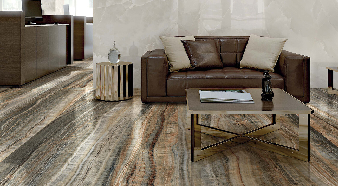 Плитка 120x60 9мм Eccentric Luxe Caramel Glossy Ret 778840 глянцевая коричневый, мультиколор камень, мрамор Rex Ceramiche