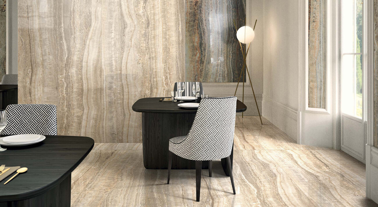 Плитка 280x120 6мм Eccentric Luxe Almond Glossy 120X280R 778822 глянцевая бежевый камень, мрамор Rex Ceramiche